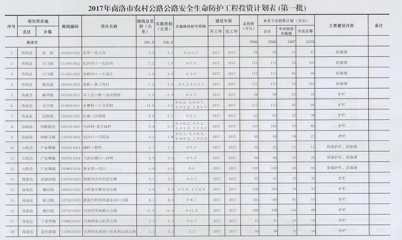 本次计划安排农村公路公路安全生命防护工程投资3700万元,其中中央投资车购税1567万元、市县自筹2133万元,实施里程156.6公里;